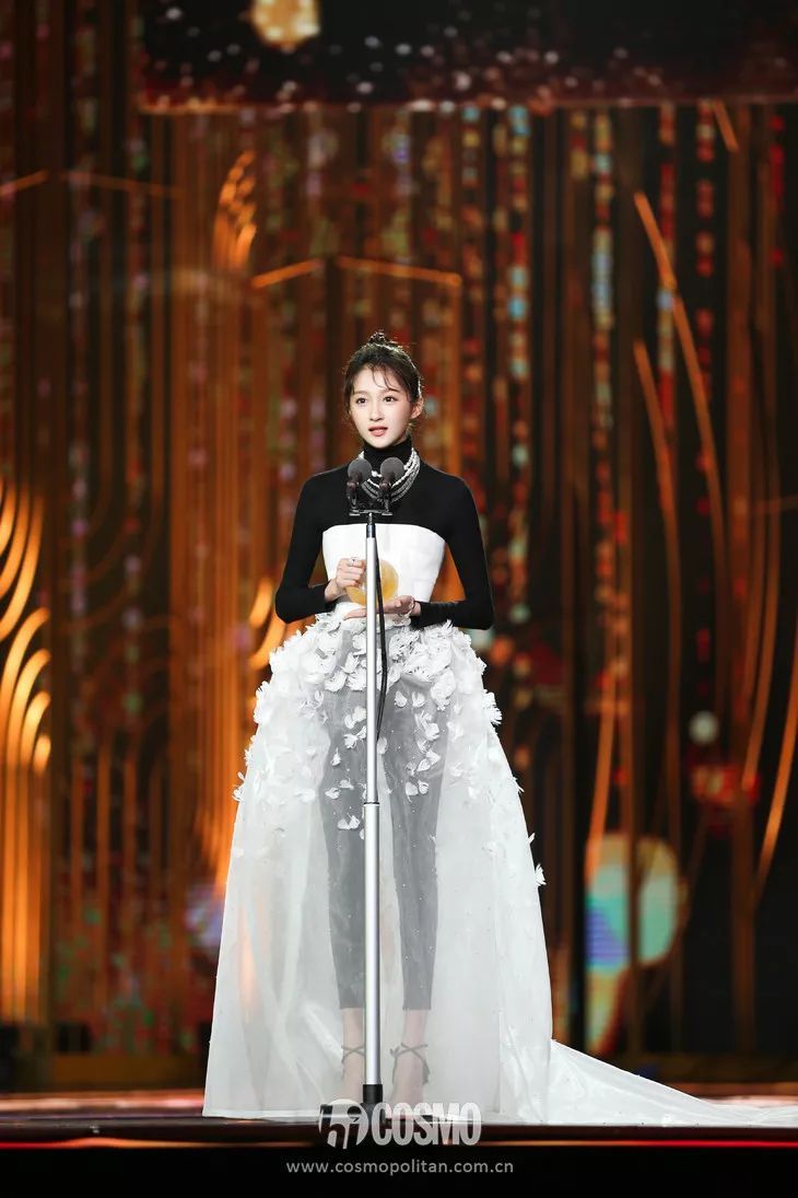 俩人的礼服品牌并不一样,不过在款式上确实略微有些相似。但在珠宝搭配还有妆容的辅助下,关晓彤干净的耳环点缀更显和谐。