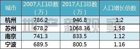 人口吸附力也是一个城市比较重要的能力。对比十年前后的总人口和增速,宁波的人口吸附能力较周边城市稍弱。统计显示,宁波2017年的人口总数为800.5万,落后于其他三个城市,去年苏州人口已达1068.36万。十年来,宁波的人口增长倍数为1.16倍,与杭州的1.2倍,南京的1.12倍基本持平。