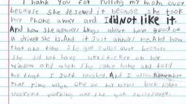 信中写道:"谢谢你们拦下我妈,这是她应得的,她拿走了我的手机,讨厌死了,她总是吹嘘自己是个很棒的司机,这只能徒增我的烦恼。有一次她被处罚因为她车窗玻璃没贴膜,她回来跟我说的时候我也只是笑一笑。还有一次我记得是她的后车灯坏了。"