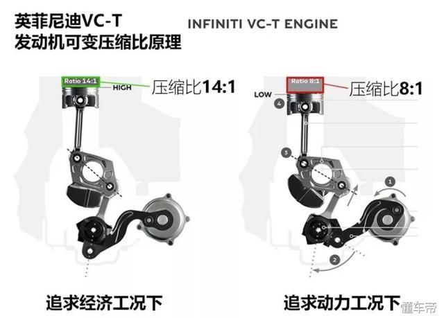 KR20则是采用偏心轮机构,改变活塞的行程,从而实现压缩比的可变。通过一套曲柄连杆机构与活塞下部连接起来,当电动机装置转动不同的角度时,可实现不同的活塞行程。借助这套机构,新发动机实现了压缩比从14:1到8:1的连续变化,而且压缩比从最大降到最低仅需1.2秒。