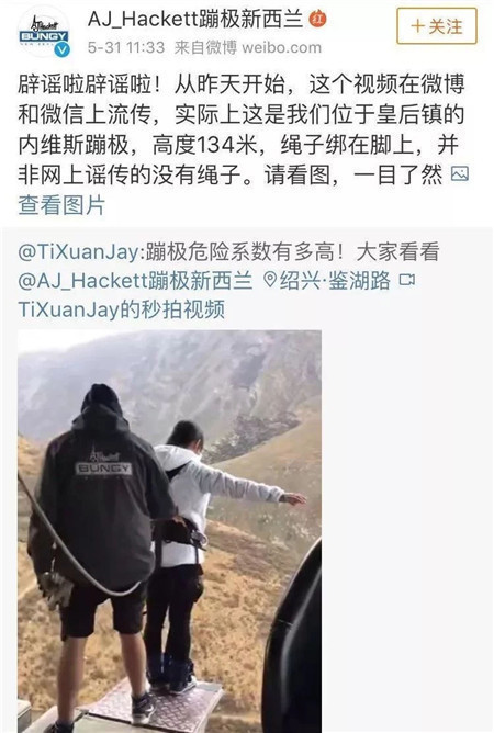 据了解,视频中的蹦极项目位于新西兰。网传蹦极没绑安全绳视频传开后,这家名叫AJ Hackett Bungy的蹦极公司通过官方微博进行了回应。