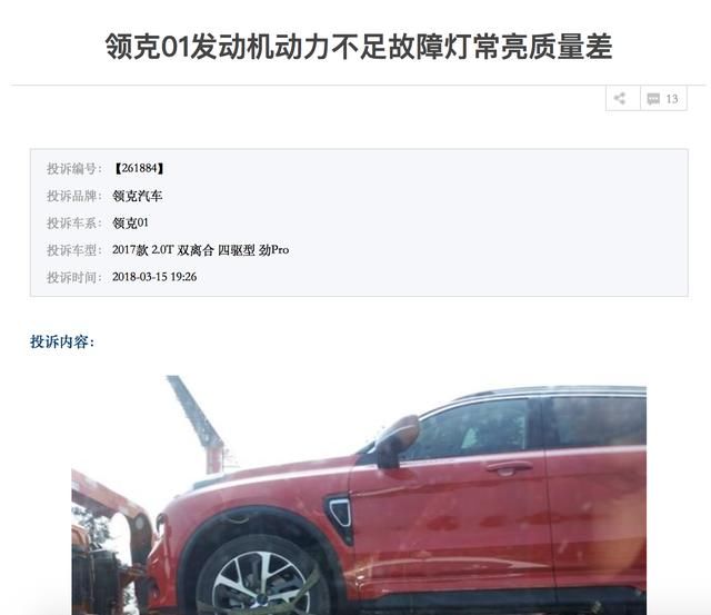这位消费者是经历了近3个月的期盼与漫长等待提了车,然而才开了202公里后,这辆领克01就出现无法提速,发动机转速达到3800转也开不到120码,动力明显不足,提速很慢的情况。车主当即与4S店联系,经过一番折腾,技术专家给出的结论有可能是传感器出现了问题,要换了新的传感器后才知道。根据车主反映,吉利方面还请网上黑客删除我的申诉贴,态度也很恶劣。一般而言,既然车辆已经上市销售,出现了问题还不能及时判断故障,只能说车辆本身就有质量问题。一款可以终生质保的车辆还没有开到家门口就出现了发动机需要维修的质量问题,这谁还敢开呢。再者有了问题,吉利这处理方式确实不妥。