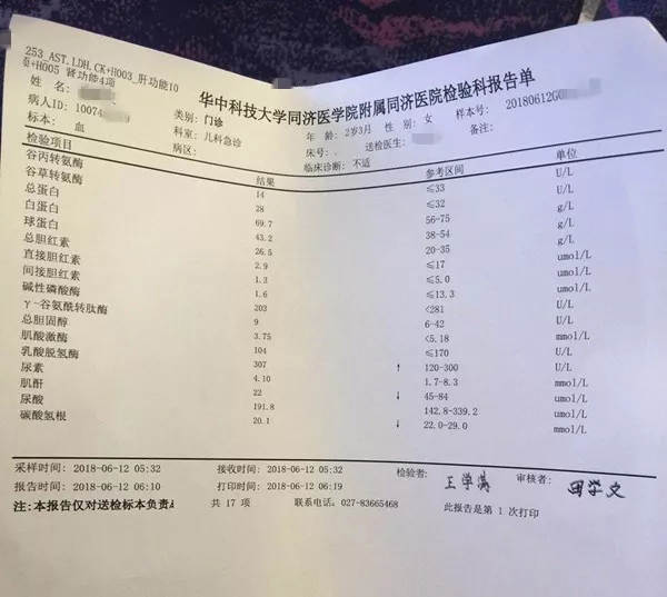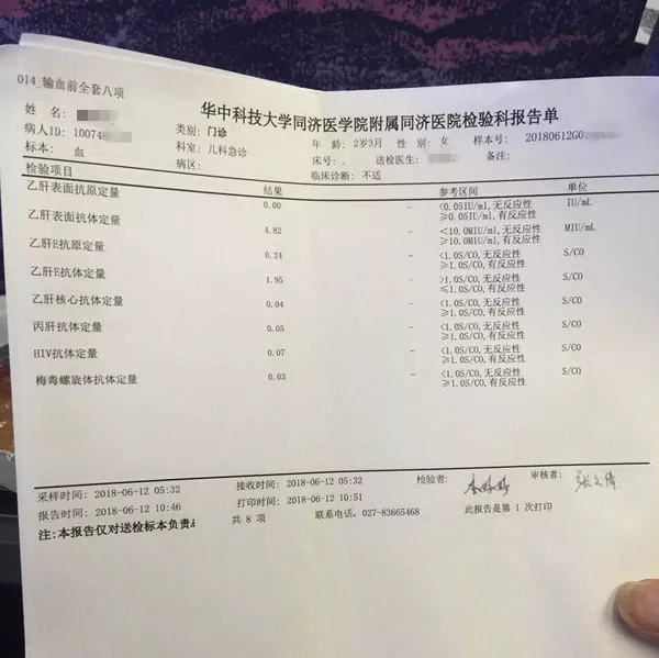 次日(12日)一大早,小陈便带着女儿赶到武汉,在华中科技大学同济医学院附属同济医院里,医生对她的女儿进行了抽血检查。几小时后,检查结果出来了,医生告诉小陈,暂时并未发现孩子有什么异常,叮嘱其带孩子先回家观察。