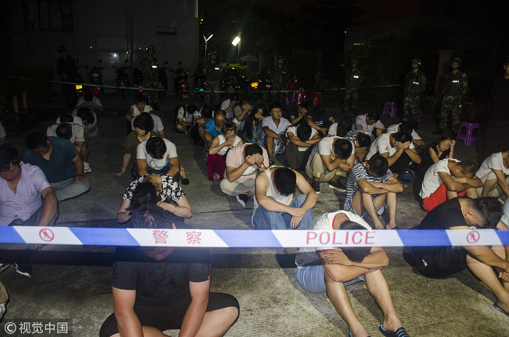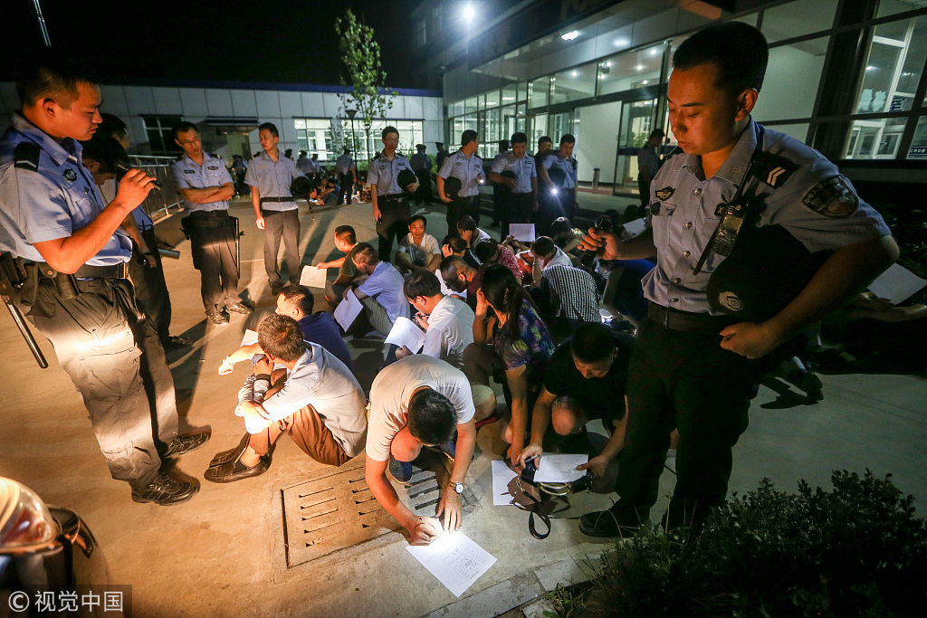 2017年8月29日凌晨,广西北海市出动2100人集中打击传销活动,清查数百个传销窝点,查获多名涉嫌传销人员。 来源:视觉中国