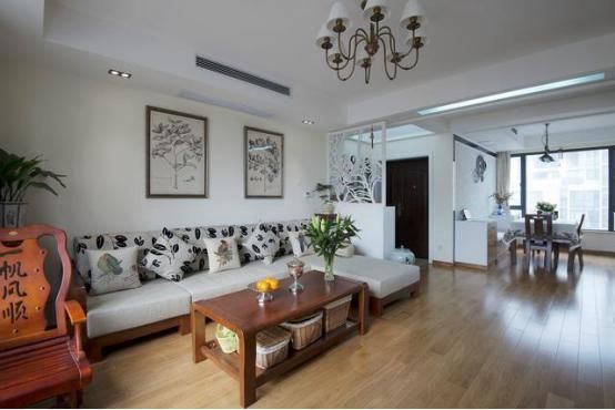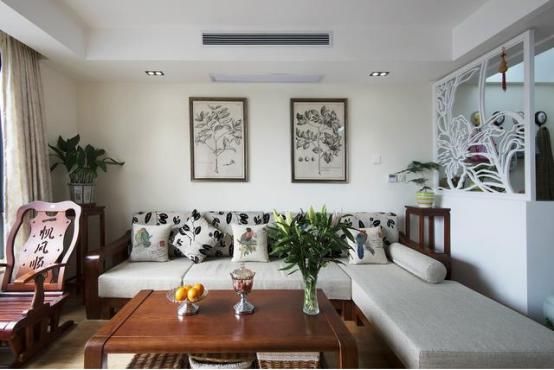 客厅沙发选用的是木质布艺结合的款式,沙发背景墙两幅挂画跟整体色调很搭,旁边还设计了一个漂亮的镂空隔断。
