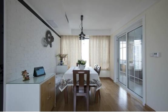 餐厅选择了实木桌椅,餐桌还铺了桌布,旁边还还打造了组合柜,厨房餐厅离得很近,就在另一边。
