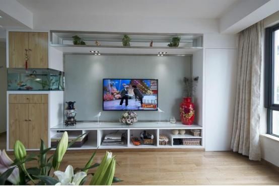 电视背景墙做的很有特色,没有复杂的造型,只有使用的收纳设计,以后家里再也不会乱糟糟了!东西归置的很整齐。鱼缸的设计是不是很特别?