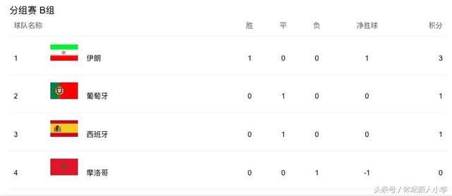 伊朗凭借着摩洛哥的乌龙球1-0取胜,时隔20年后再次取胜,亚洲一哥终于证明了自己,可他们的前景并不被看好。葡萄牙和西班牙强强对话中打平,两队也是本组晋级热门。