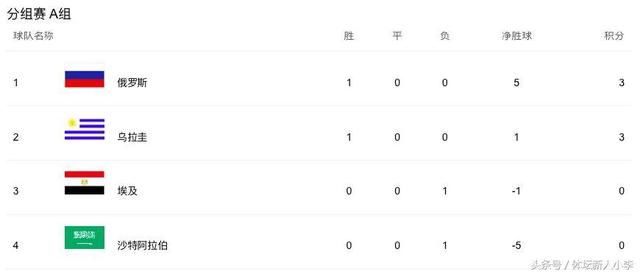 A组:俄罗斯5-0大胜沙特强势领跑,乌拉圭终场前绝杀埃及紧随其后。