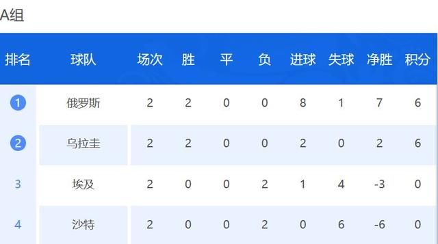 首轮比赛,A组俄罗斯和乌拉圭赢球。在第二轮的比赛中,俄罗斯率先出战,他们3比1击败埃及,出现在望。乌拉圭面对沙特,尽管沙特表现有所好转,但是门将的一次失误还是给了苏亚雷斯机会。依靠苏神的进球,乌拉圭1比0击败沙特,这让A组的局势更为清晰。俄罗斯和乌拉圭提前出线,末轮两队争夺小组第一。俄罗斯有净胜球的优势,只要末轮打平就可以锁定小组第一。
