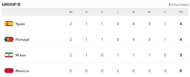有意思的是,西班牙和葡萄牙同分领跑,进球数、净胜球都一样。按照规则,两队比较黄牌的数量,西班牙是1张,葡萄牙2张,这样一来西班牙暂时领跑。末轮比赛,西班牙对阵提前出局的摩洛哥,葡萄牙对阵伊朗。西班牙只要打平就可以锁定一个出线名额,甚至如果输球,而且输球的比分和葡萄牙一样,而且没有拿到红黄牌的话,西班牙也可以出线,这是极端情况。葡萄牙和伊朗争夺一个名额,葡萄牙同样是打平就可以出线。伊朗想要出线,必须要击败葡萄牙。如果伊朗爆冷击败葡萄牙,他们甚至可能拿到小组第一。如果西班牙和葡萄牙最后积分一样,进球、净胜球、红黄牌也一样的话,那将通过抽签来决定排名。
