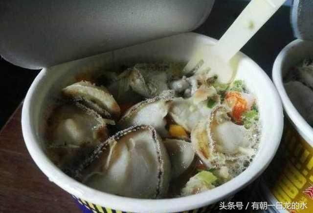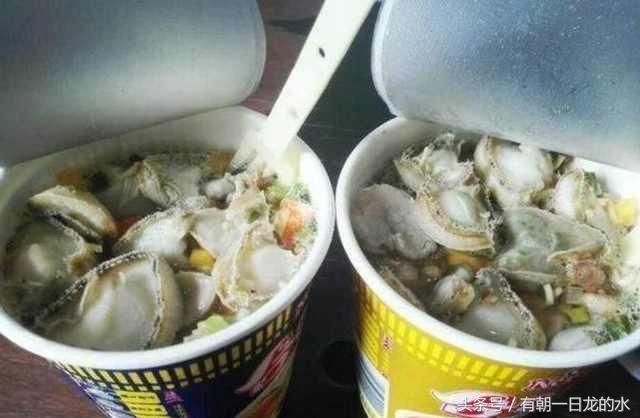 去到他工作的地方之后,我发现他生活得并没有我想象的那么艰辛,因为他虽然每天都是泡面,但是他的泡面很高级啊。他每碗泡面的配菜都是新鲜的海鲜,尤其是鲍鱼。鲍鱼放在泡面上吃,多么奢侈啊。