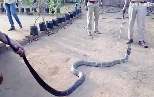 这个时候,大家终于明白了!眼镜王蛇是来找水喝的。为防止被攻击,一男子就一手拿水,一手拿捕蛇工具防身。
