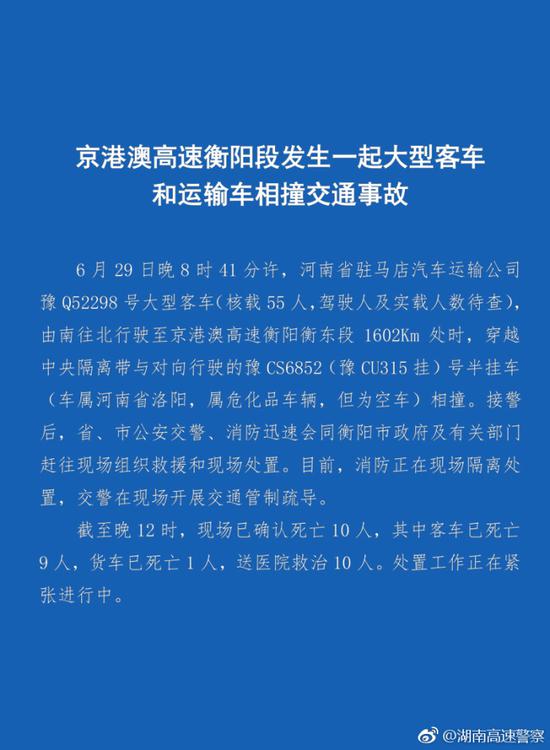京港澳高速衡阳段发生一起大型客车和运辅车相撞交通事故,6月29日晚8时41分许,河南省驻马店汽车运输公司豫Q52298号大型客车(核载55人,驾驶人及实载人数待查),由南往北行驶至京港测高速衡阳衡东段1602Km处时,穿越中央隔高带与对向行驶的豫CS6852(豫CU315挂)号半挂车(车属河南名洛阳,属危化品车辆,但为空车)相撞。接警后省、市公安交警、消防迅速会同衡阳市政府及有关部门赶往现场组织救提和现场处置。日前,消防正在现场隔离处置。交警在现场开展交通管制疏导。