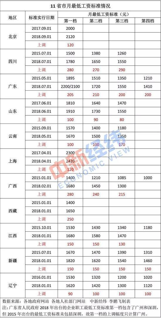 公开资料显示,除上述11省市外,安徽、重庆的最低工资标准也很有可能在2018年上调。