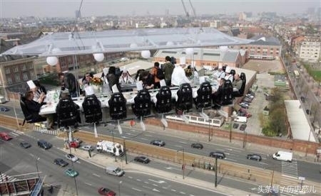 这家名为“空中餐厅”的所谓“餐厅”,没有地板、没有门窗,只有一张被大吊车吊到150英尺(约合46米)高的大桌子及一圈22张椅子。顾客用餐前,要先系好安全带,然后随同一桌美味佳肴一起吊上半空中,一边欣赏美景,一边用餐。