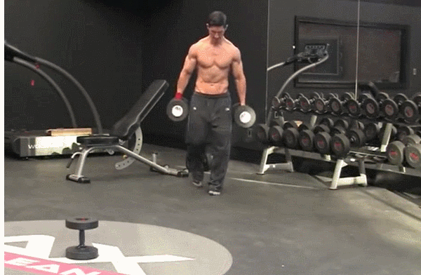 这是一个既简单又高效的训练动作,只需要你双手握住自己所能承受的最大重量来回行走,便可达到优秀的训练效果。由于在行走过程中,你是双脚左右交替单腿站立,所以重心也在不断改变,想要让核心维持稳定就比单纯静止握住哑铃更具有挑战性。
