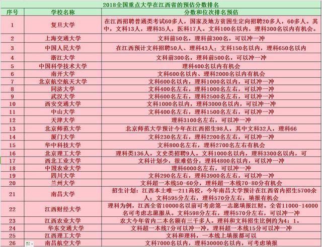 在江西省内,知名的高校并不多,除了南昌大学以211大学的身份入选了世界一流学科建设高校之外,整个江西省内并没有其它高校入选双一流。所以在江西省比较出名的江西财经大学,江西理工大学,东华理工大学,南昌航空大学,事实上在全国范围内的知名度并不是太高。虽然,江西省内好大学不多,但是并不影响众多的双一流大学到江西省招收优秀的高三学子。下面是我国部分双一流大学和江西省内高校2018年的高考预估分数线情况: