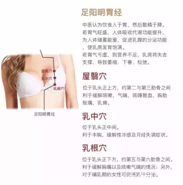 1、以乳头垂直地面的直线为足阳明胃经。乳房不饱满、乳房较小、乳房内有结节者皆属足阳明气血虚弱,而脾胃功能较好者乳房则丰满圆润。