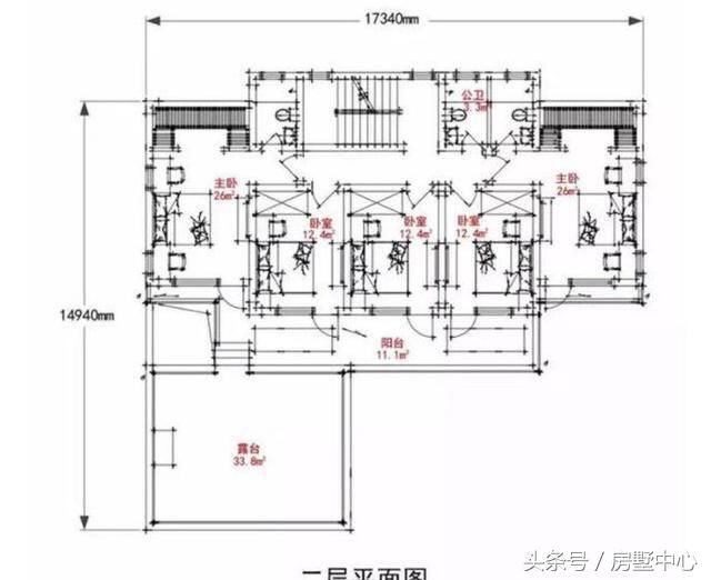 二层平面图二楼功能区设有:五室一卫一阳台,其中东西两端的卧室是超大套房,另有公共阳台和露台。
