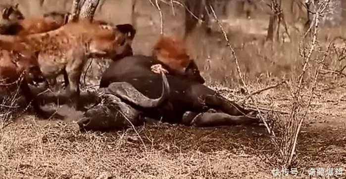 在草原上,一群鬣狗猎杀到了一只野牛,正在啃食
