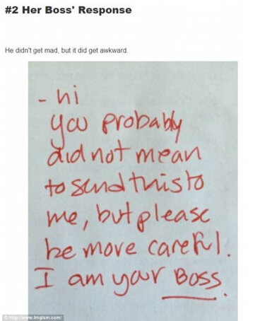 这位老板是手写的回复,然后拍下了皂片发给了妹子,老板是酱紫说的:嗨,你可能并没打算把这个发给我,但是请更加细心些,我是你老板。恩,老板还特别把“老板”二字大写并加了下划线,可能是在强调问题的严重性吧~
