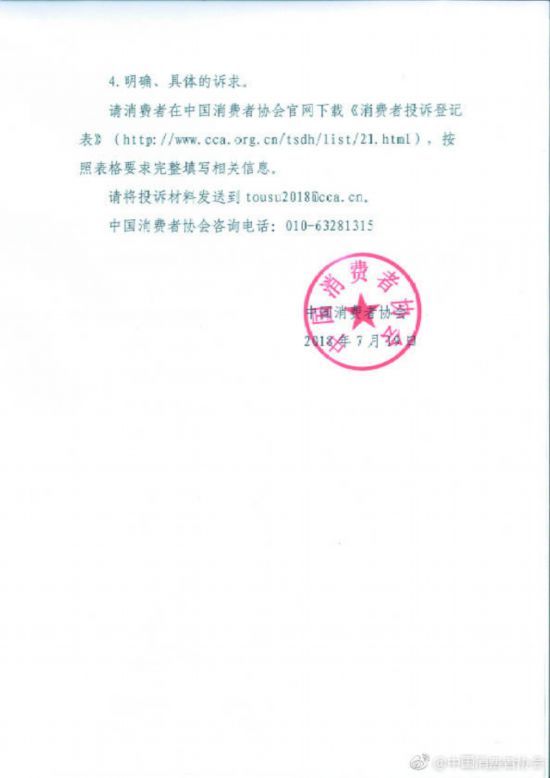 此外,中消协在《公告》提醒相关消费者,可前往中国消费者协会官网下载《消费者投诉登记表》,按照表格要求完整填写相关信息,并将投诉材料发送到电子邮箱tousu2018@cca.cn。《公告》还公布了中消协咨询电话:010-63281315。(人民日报客户端)