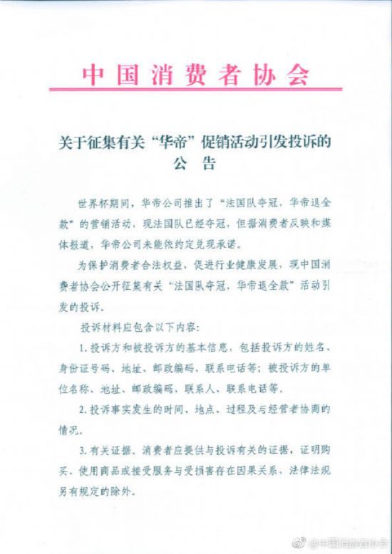 [分享]中消协公开征集华帝“法国队夺冠退全款”活动的投诉