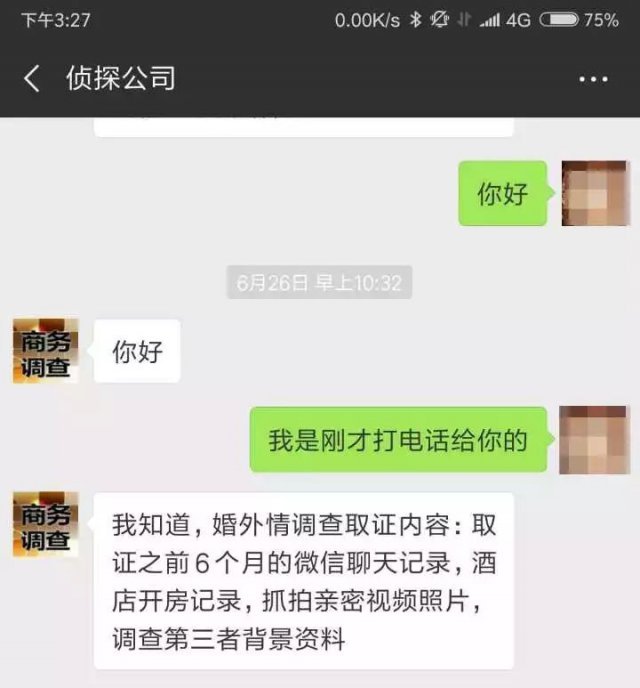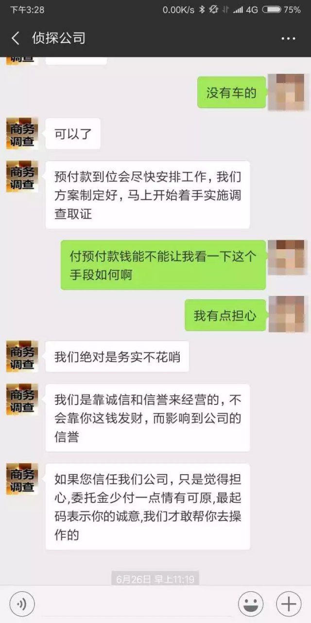 电话那头的 " 私家侦探 " 称可以帮张女士查该李姓女子半年内的通话记录、微信记录、开房记录等一系列个人资料,一套服务只需 8800 元,付定金后五至十天便会有结果,张女士立刻往对方的银行账户上汇了 4000 元的定金。