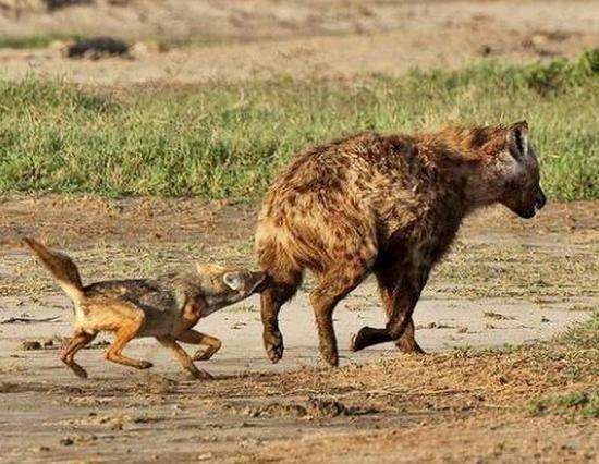胡狼一路未遂鬣狗,饿昏头把鬣狗当成自己的食物。  见鬣狗丝毫没有发现自己,一口咬上鬣狗屁股。  却上了鬣狗的当,反被鬣狗当成了晚餐。  胡狼简直太过自信,还真当鬣狗跟你一样傻啊!