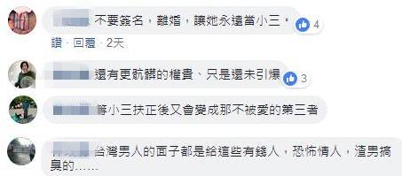 对此,台湾网友表示:"不要离婚,让她永远当小三""等小三被扶正后又会变成那不被爱的第三者""台湾男人的面子都是给这些有钱人、恐怖情人、渣男搞臭的"。
