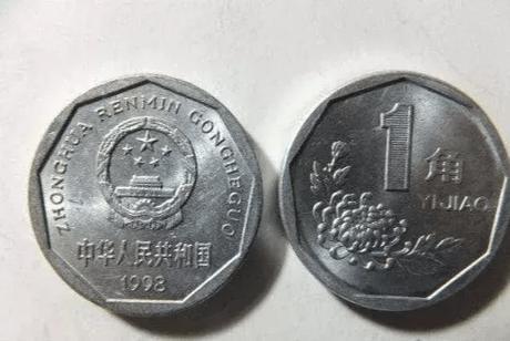 “菊花1角”采用“外圆内凹九边形”的设计,正面图案为菊花图案,面值为1角,背面图案为国徽、汉字中华人民共和国与汉语拼音加上发行年号。