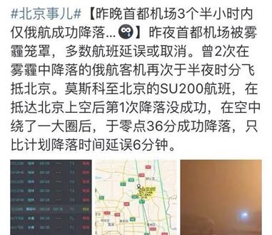 2016年11月,北京雾霾围城,首都机场的航班大面积延误或取消,国泰航空飞北京的航班降3次失败,最后返港。但是曾数次在雾霾中成功降落的俄航SU200航班,在抵达北京上空后第一次降落没成功,在空中绕了一大圈后成功降落,只比计划降落时间延误6分钟,成为首都机场 3 个半小时内唯一成功降落的飞机。