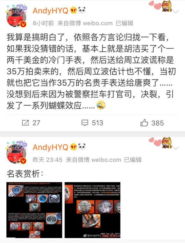7月22日,唐爽晒出这块表,并讽刺地写道:“感谢周立波、胡洁女士曾经赠与我的这只名贵手表,礼轻情意重!我也不是很懂表,不知道原来那么贵重。希望有专家来科普一下。”
