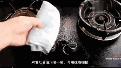 对着灶台油污喷一喷,再用抹布擦拭,灶台就很干净啦!