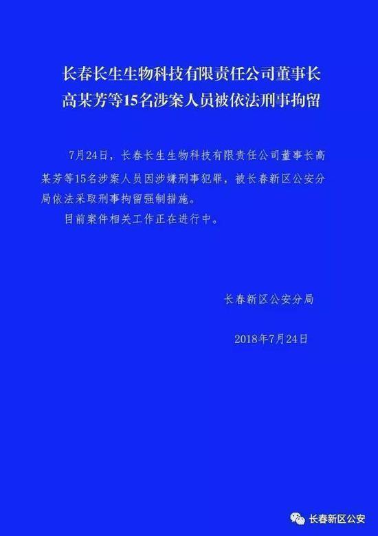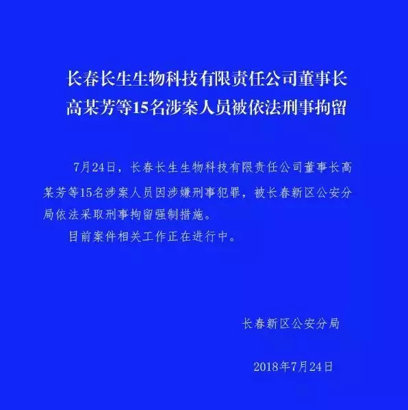 7月24日晚8时,长春新区公安分局发布最新消息称,长春长生生物科技有限责任公司董事长高某芳等15名涉案人员因涉嫌刑事犯罪,被长春新区公安分局依法采取刑事拘留强制措施。目前案件相关工作正在进行中。