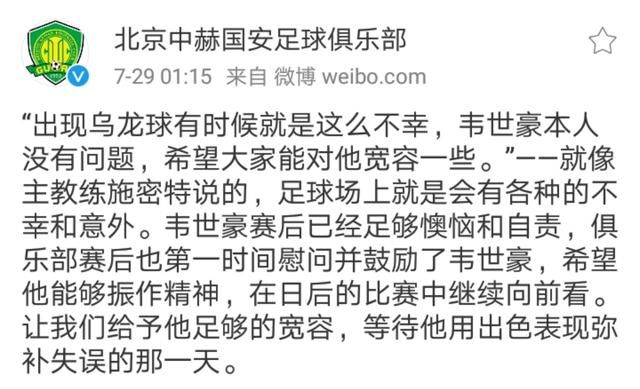 赛后北京国安官微发推:出现乌龙球有时候就是这么不幸,韦世豪本人没有问题,希望大家能对他宽容一些。——就像主教练施密特说的,足球场上就是会有各种的不幸和意外。韦世豪赛后已经足够懊恼和自责,俱乐部赛后也第一时间慰问并鼓励了韦世豪,希望他能够振作精神,在日后的比赛中继续向前看。让我们给予他足够的宽容,等待他用出色表现弥补失误的那一天。