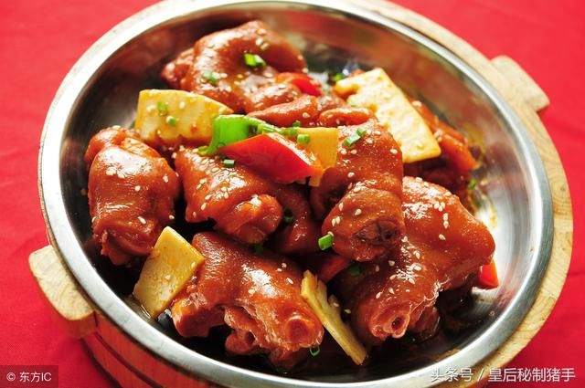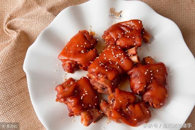 制作 1.新鲜猪手剁成大块,放入冷水锅内,倒入白酒大火焯透。2.锅内放入色拉油,烧至五成热时放入小料炸香,倒入A料大火烧开即成卤料,放入猪手微火加热1小时。3.将做好的猪手用铁锅煎至上色,出锅前加入鲜花椒爆香,摆盘装饰即可。