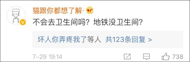 此外,微博上还有一条点赞相当高的评论,是质疑他们“为什么不去卫生间”。