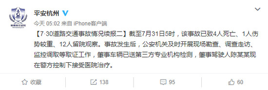 @平安杭州:【7·30道路交通事故情况续报二】截至7月31日5时,该事故已致4人死亡、1人伤势较重、12人留院观察。事故发生后,公安机关及时开展现场勘查、调查走访、监控调取等取证工作,肇事车辆已送第三方专业机构检测,肇事驾驶人陈某某现在警方控制下接受医院治疗。