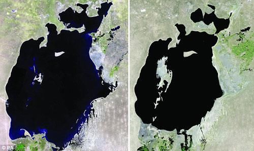 在1960年,这个咸水湖的面积是6.8万平方千米,是一个大湖;1987年,咸海分成两部分:北咸海和南咸海;在1998年,已经缩小到2.9万平方千米;后来湖中的复活岛开始与大陆相连成为半岛,将南咸海被分割成了两个小湖。而到了2004年,就只剩下1.7万平方千米了,成了由3个小湖组成的湖群。