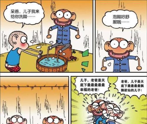 呆老爸很欣慰呆头长大了,都会给他打洗脚水让他泡脚了。呆头被呆老爸抱的有点害羞,想着这是他应该做的。呆老爸突发奇想,想着要是可以一直泡脚就好了,可以留住那种温暖的感觉。