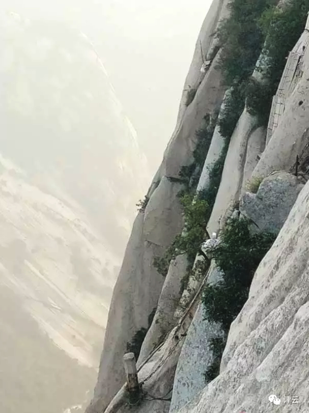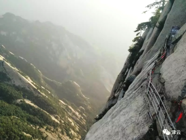 长空栈道位于南峰绝壁之上,被称为华山天险之首。此处海拔约2070米,和华山最高峰南峰的2154.9米海拔相差还不到100米,站在栈道入口处一侧的小平台上,旁边即是垂直陡削的悬崖峭壁,用万丈深渊形容也不为过,连素来不恐高的记者往下望去也不禁双腿发软。