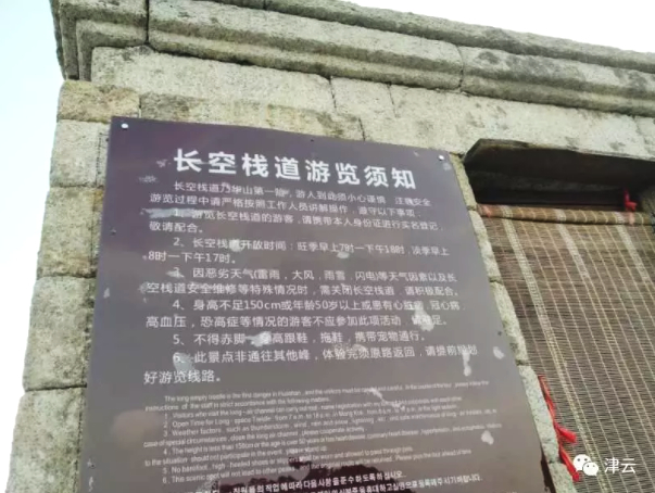 对于长空栈道这一惊险刺激的游乐项目,入口处张贴着醒目的游览须知,其中提醒身高不够、年龄过大或患有恐高症、高血压等病症的游客不应参加此项目。