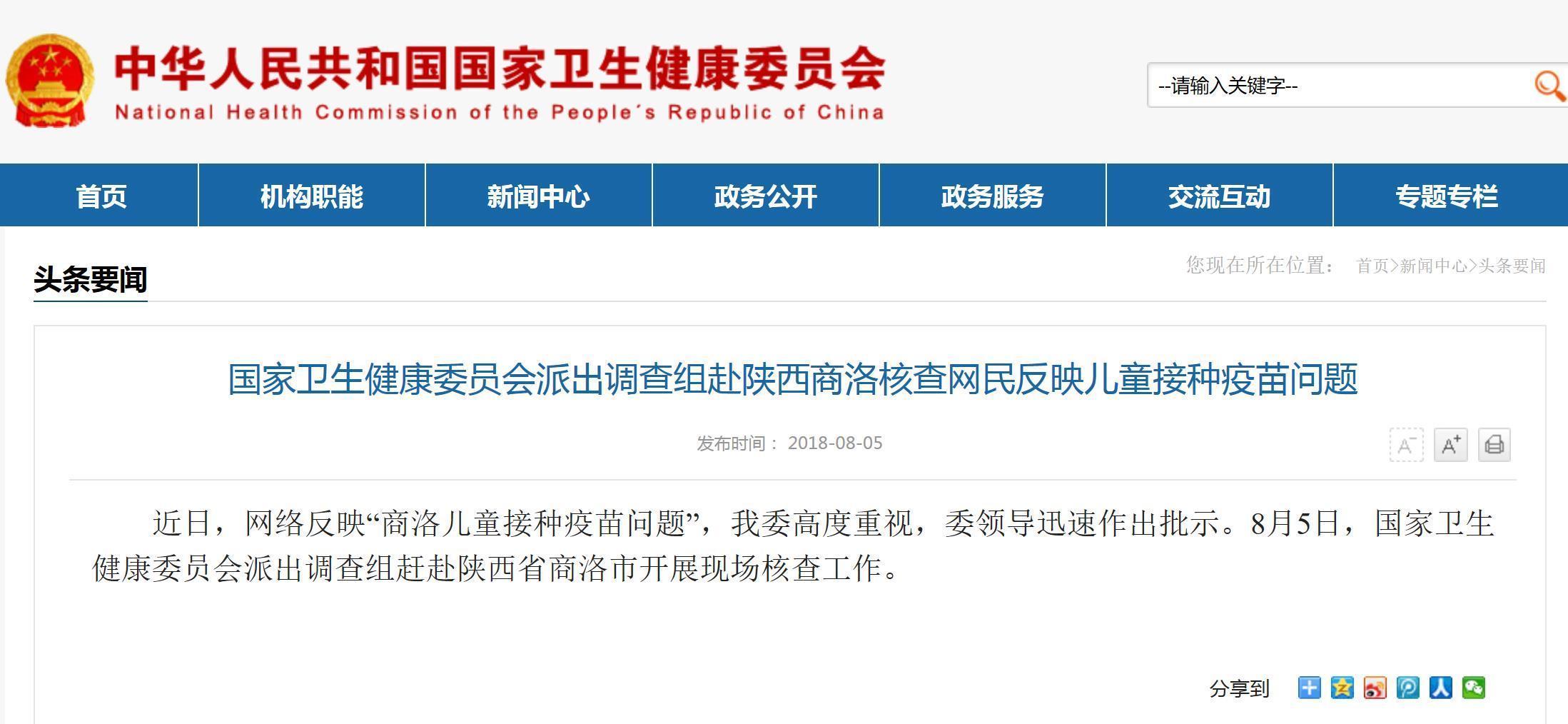 来源:国家卫健委网站截图今日(8月5日)凌晨,陕西省商洛市人民政府发布消息称,2018年8月3日,网络反映“商洛发现多例儿童接种过期疫苗”。商洛市委、市政府立即安排部署,成立联合调查处置领导小组,连夜开展调查处置工作。商洛市人民政府表示,经调查,网络反映的乙脑减毒活疫苗、A群流脑多糖疫苗、无细胞百白破疫苗、麻腮风疫苗等均在有效期内。目前,市上已对相关责任人采取措施,立案调查,启动问责程序。同时,省卫计委、省食药监局、省疾控中心等相关部门专家对商洛市市初查结果正在进一步核查。此前