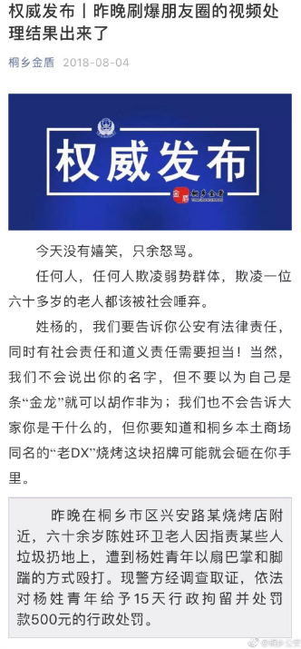 这句话的出处,可不是哪条网友热评或者哪封举报信,而竟是浙江桐乡公安局的官方通报。
