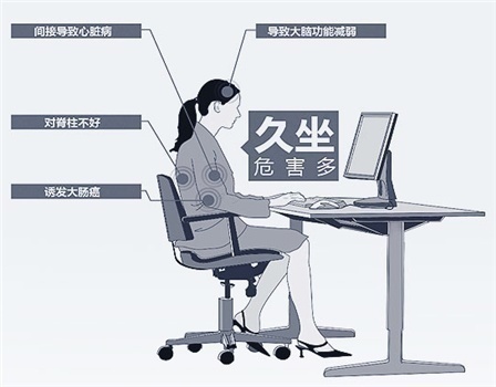 世界卫生组织(WHO)早已将久坐列为十大致死致病元凶之一。据统计,全球每年有200多万人因久坐死亡,预计到2020年,全球将有70%的疾病由久坐引起。西安体育学院健康科学系教授苟波表示,久坐少动是当今典型的静态生活方式,会给健康带来诸多伤害。比如,身体坐位前倾20度时,腰椎承受的压力是直坐的几倍,长此以往可能导致腰肌劳损、腰椎间盘突出等疾病;久坐还会导致血液循环受阻,直肠静脉丛发生静脉曲张,进而导致痔疮,增大罹患结肠癌的风险。