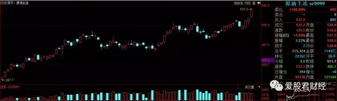 当前国际油价在69美元附近,当前汇率为6.86,折合人民币为473元/桶,而中国的原油期货已经涨到了537元/桶,相当于比国际油价高开13.5%。