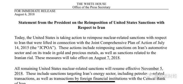 报道】当地时间8月7日零时,美国将正式重启对伊朗的经济制裁!此前,美国要求各国11月完全停止从伊朗进口石油!