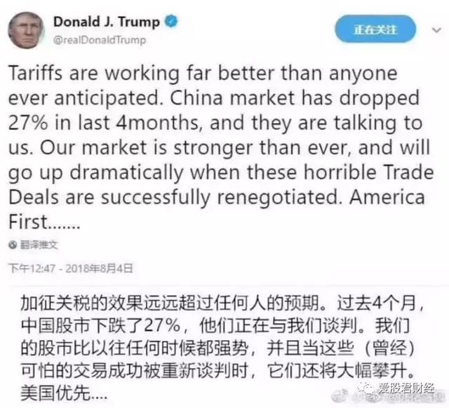 周末,特朗普一条“过去四个月让中国股市下跌27%”的推特,点燃中国股民的情绪……